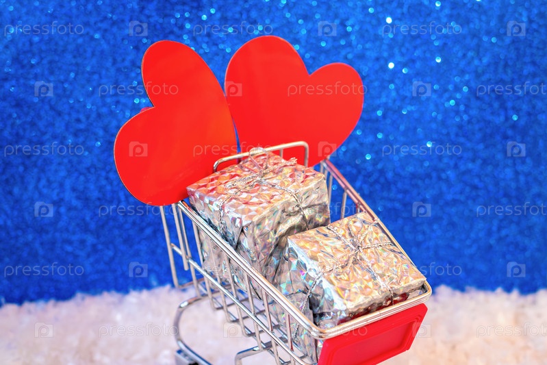 Два красных сердца и подарочные коробки в корзине на блестящем синем фоне со снегом. Концепция покупки подарков и сюрпризов на День святого Валентина