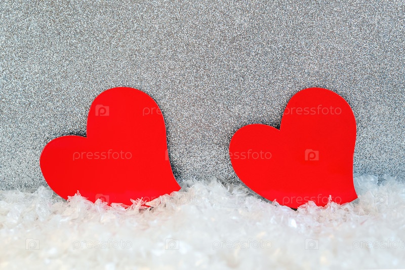 Крупный план двух красных сердец на серебряном блестящем фоне со снегом. Концепция Дня святого Валентина, романтических отношений и свиданий