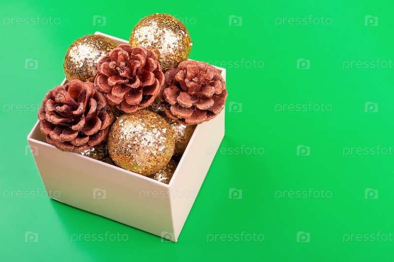 Подарочная коробка с блестящими шишками и золотыми елочными шарами на зеленом фоне. Праздничный фон с копией пространства