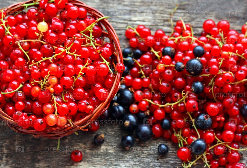 Ягоды черной и красной смородины лежат в корзине и на деревянной поверхности
