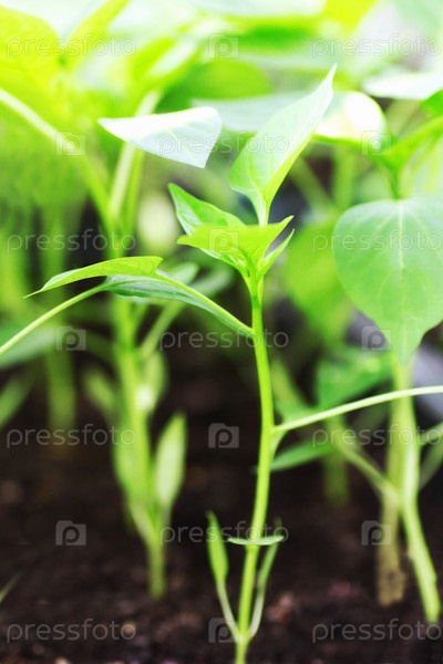 Росток зеленого перца, выращенный из семян дома крупным планом на солнечном свете