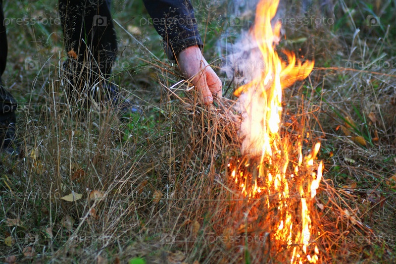 Часть изображения человека, сжигающего сухую траву