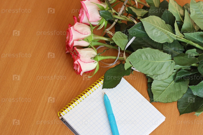 Букет цветов и блокнот с ручкой