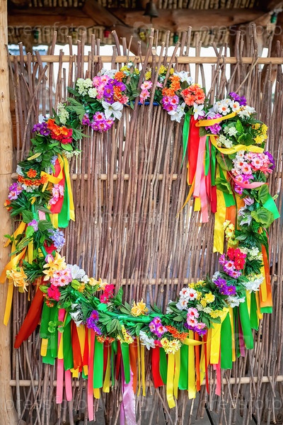 Крупный план венка с искусственными цветами и разноцветными лентами