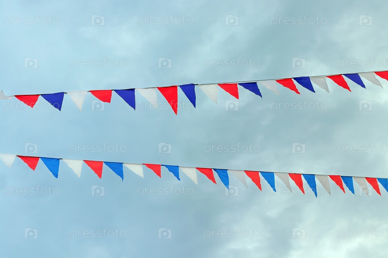 Маленькие флажки красного, синего и белого цветов на веревке висят снаружи для отдыха на фоне облачного неба. Декоративная гирлянда для украшения