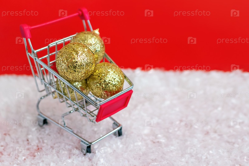 Крупный план корзины, полной блестящих игрушечных шариков на снегу на ярко-красном фоне. Концепция рождественских и новогодних распродаж и скидок. Покупка подарков и благотворительность. Доставка подарков. Копировать пространство