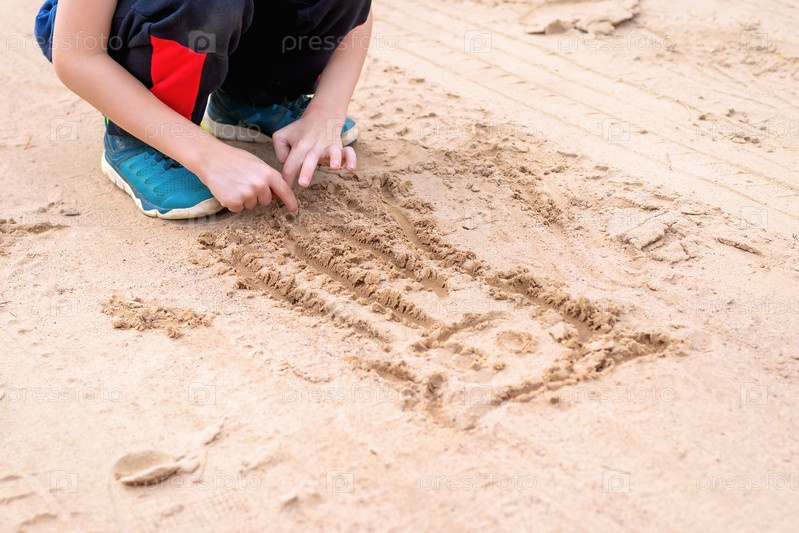 Маленький ребенок рисует пальчиками на песке забавное животное