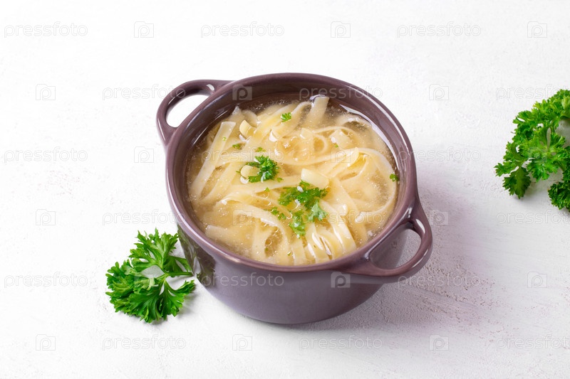 Куриный бульон с яичной лапшой с петрушкой. Горячая еда подается в маленькой кастрюле на белом столе