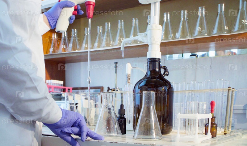 Руки ученого наливают раствор в колбы