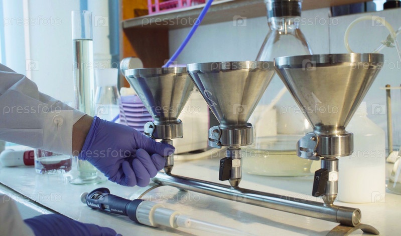 Лаборатория химического анализа. Ученый регулирует вакуумный фильтр