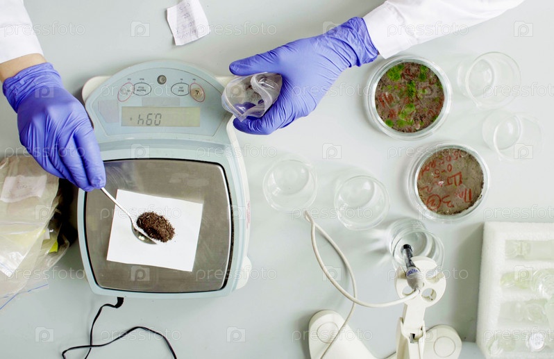 Руки ученого взвешивают образец почвы