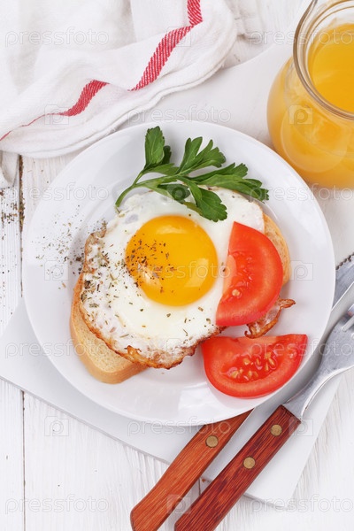 Бутерброд с яичницей и апельсиновым соком на белом фоне