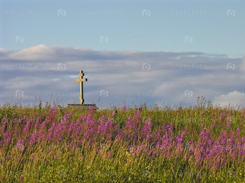 Поклонный православный крест на фоне неба. Берег реки Илекса, Архангельская область. Солнечный день в июле