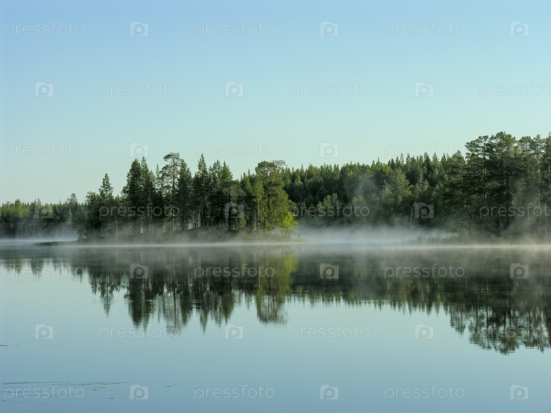 Утренний туман над рекой. Река Кереть, Карелия. Солнечный день в июле