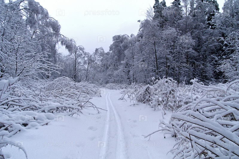 Лыжня в зимнем лесу. Пасмурный день в январе. Ближнее Подмосковье