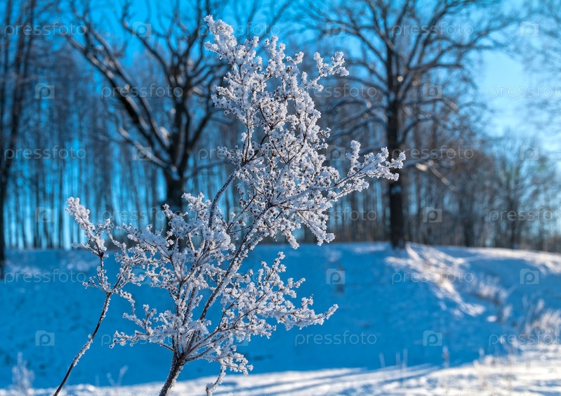 Ветка куста, покрытая инеем. Солнечный день в январе