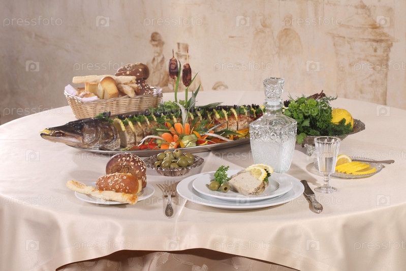Стол с фаршированной щукой, водкой, самогоном в ресторане