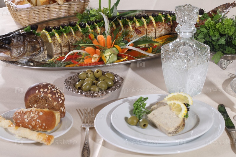 Стол с фаршированной щукой, водкой, самогоном в ресторане