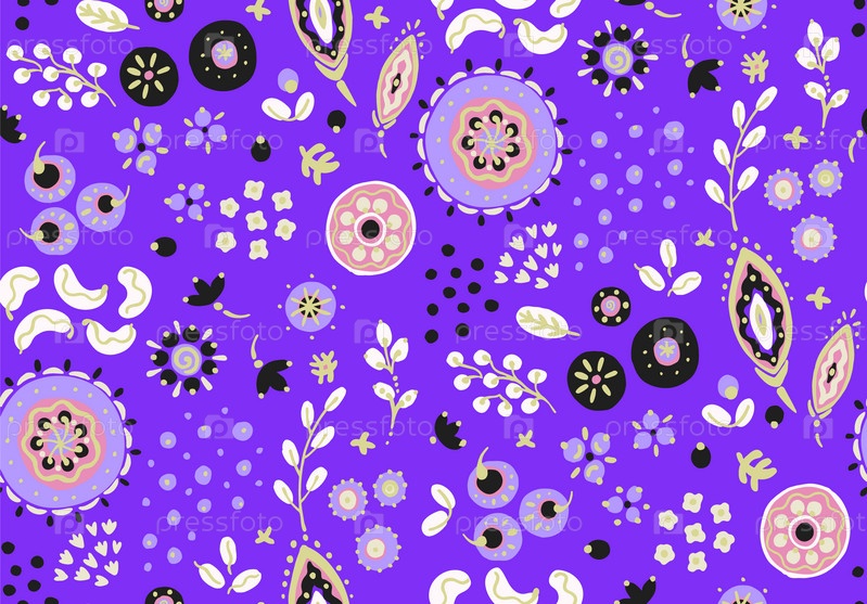 Бесшовный узор с фантазийными цветами, этнический вращающийся повторяющийся дизайн ткани и плитки, натуральные обои, иллюстрация завитка цветочного декора. Пейсли печатает рисованные элементы. Домашний декор