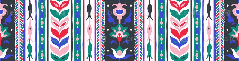 Геометрический дамасский орнамент. Икат границы. Этническая вышивка с листьями и монограммами. Племенная векторная текстура. Бесшовный народный узор в ацтекском стиле. Индийский, скандинавский, цыганский, мексиканский, африканский ковер