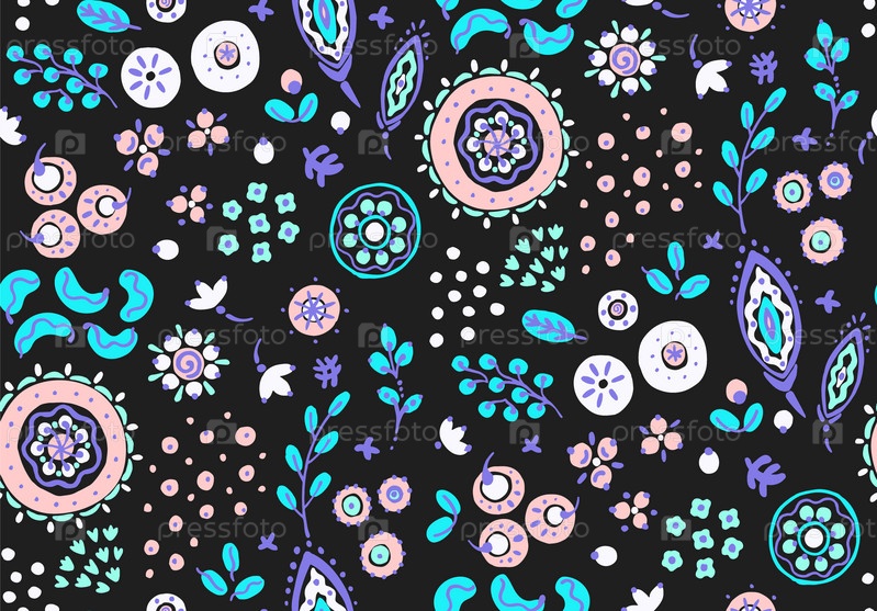 Бесшовный узор с фантазийными цветами, этнический вращающийся повторяющийся дизайн ткани и плитки, натуральные обои, иллюстрация завитка цветочного декора. Пейсли печатает рисованные элементы. Домашний декор