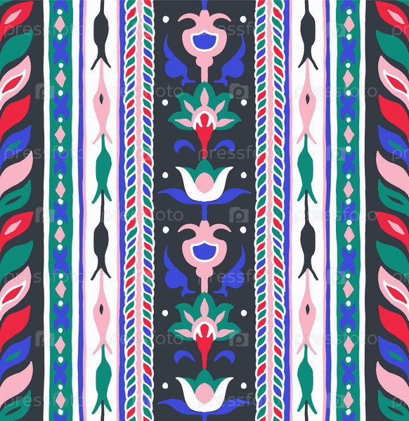 Геометрический дамасский орнамент. Икат границы. Этническая вышивка с листьями и монограммами. Племенная векторная текстура. Бесшовный народный узор в ацтекском стиле. Индийский, скандинавский, цыганский, мексиканский, африканский ковер