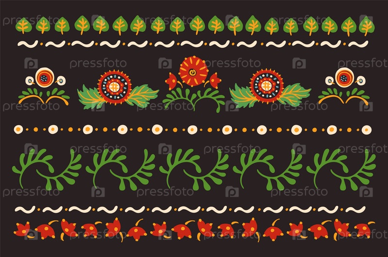 Набор этнических элементов. Бордюр представляет собой полосу с цветами, листьями, ветками, вензелями. Народная вышивка. Славянский, украинский, русский мотив. Хохлома, матрешка, дымковская игрушка. Мексиканский, индийский, цыганский ковер. Вязаное кружево