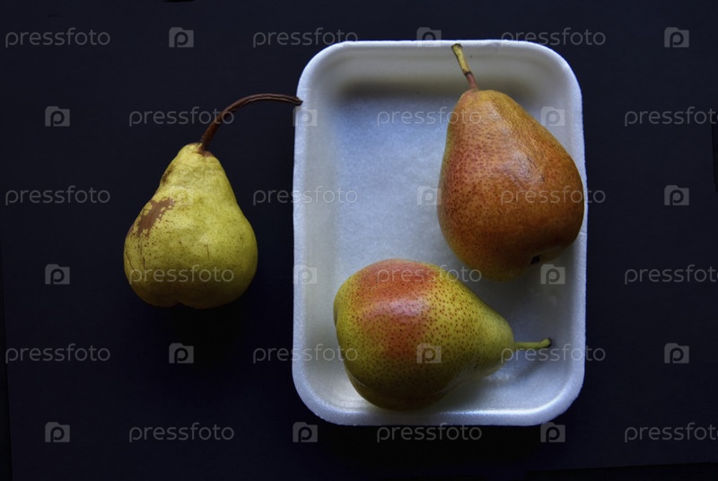 Красные и зеленые груши на черном фоне. Груши в упаковке из магазина. Красивые плоды груши