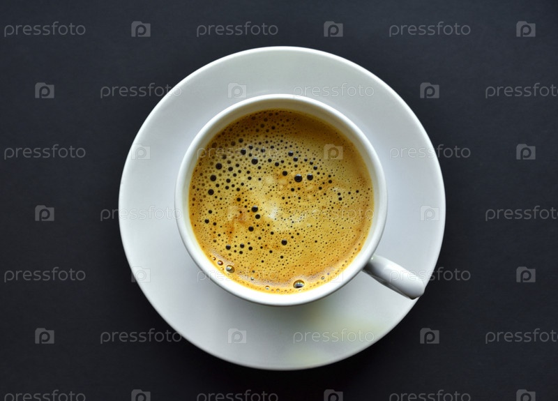 Сочный свежесваренный кофе с пеной в белой чашке на черном фоне. Красивая чашка кофе крупным планом сверху