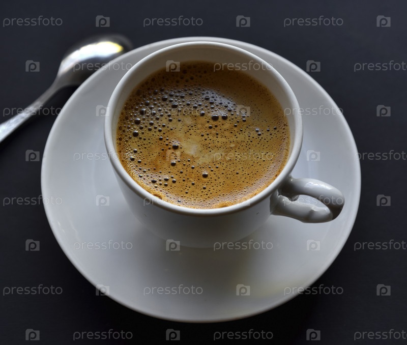 Сочный свежесваренный кофе с пеной в белой чашке на черном фоне. Красивая чашка кофе крупным планом сверху