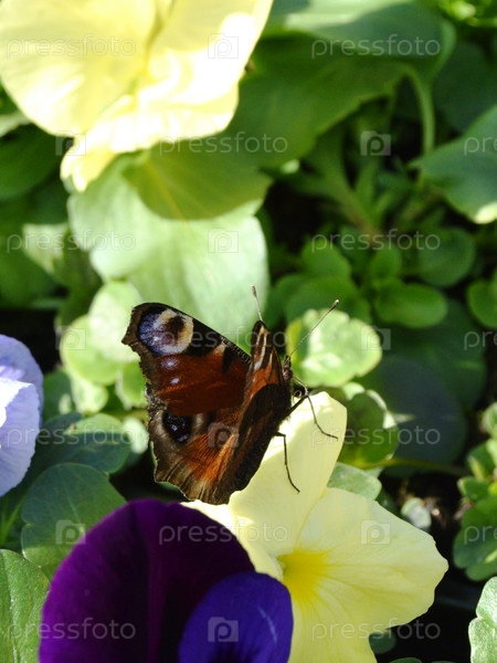 Бабочка на анютиных глазках в саду