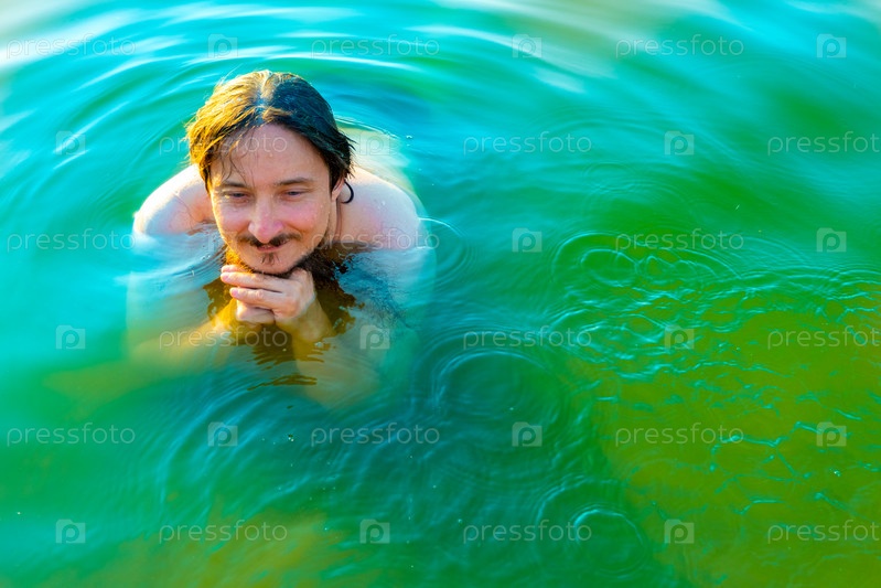 Мужчина плавает в озере с голубой водой
