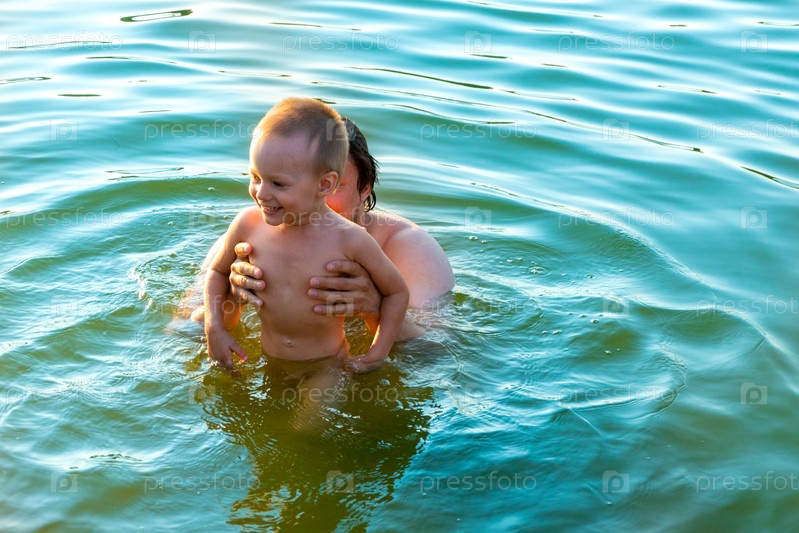 Маленький мальчик на руках у отца, в морских волнах. Папа с маленьким ребенком в отпуске