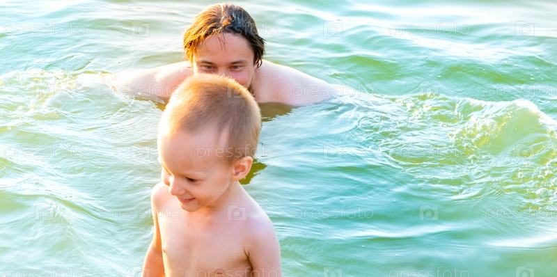 Маленький мальчик плещется с отцом в волнах озера. Папа с маленьким ребенком в отпуске