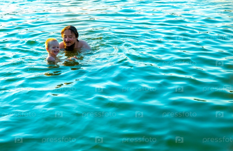 Маленький мальчик на руках у отца, в морских волнах. Папа с маленьким ребенком в отпуске