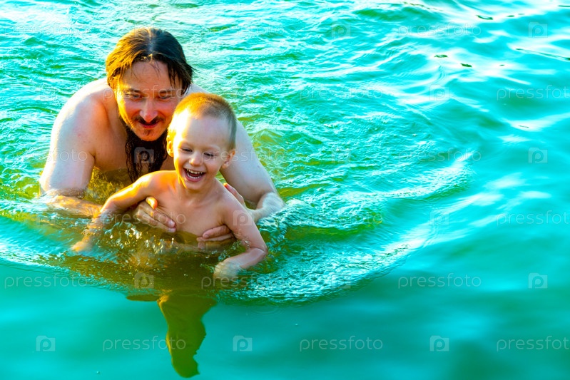 Маленький мальчик на руках у отца, в морских волнах. Папа с маленьким ребенком в отпуске