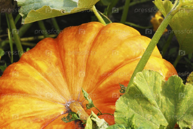 Большая большая оранжевая тыква среди больших зеленых листьев