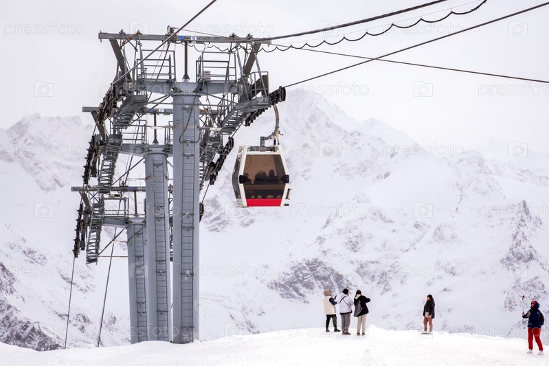 Горный пейзаж с пилонами и кабинами высокогорной канатной дороги