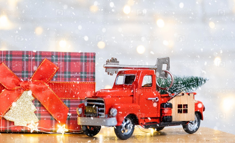 Красный ретро-автомобиль с елкой украшает ключ от дома в пикапе на Рождество. Покупка жилья, переезд, ипотека, кредит, недвижимость, праздничное настроение, Новый год