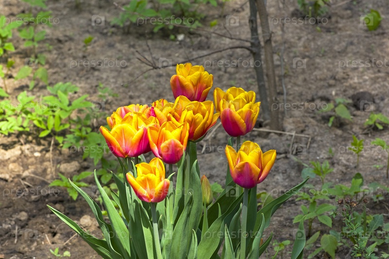 Красивые красно-желтые тюльпаны на клумбе. Солнечный день в мае. Аптекарский Огород (филиал ботанического сада МГУ), Москва