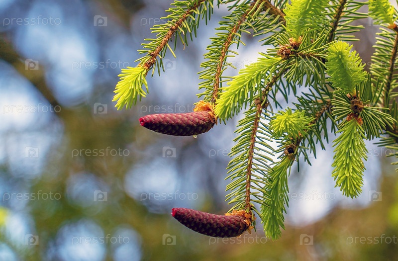 Еловые шишки растут рядом на ветке с иголками. Новые фрукты