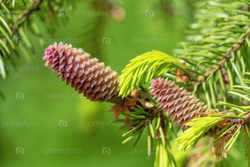 Еловые шишки растут рядом на ветке с иголками. Новые плоды хвойного дерева
