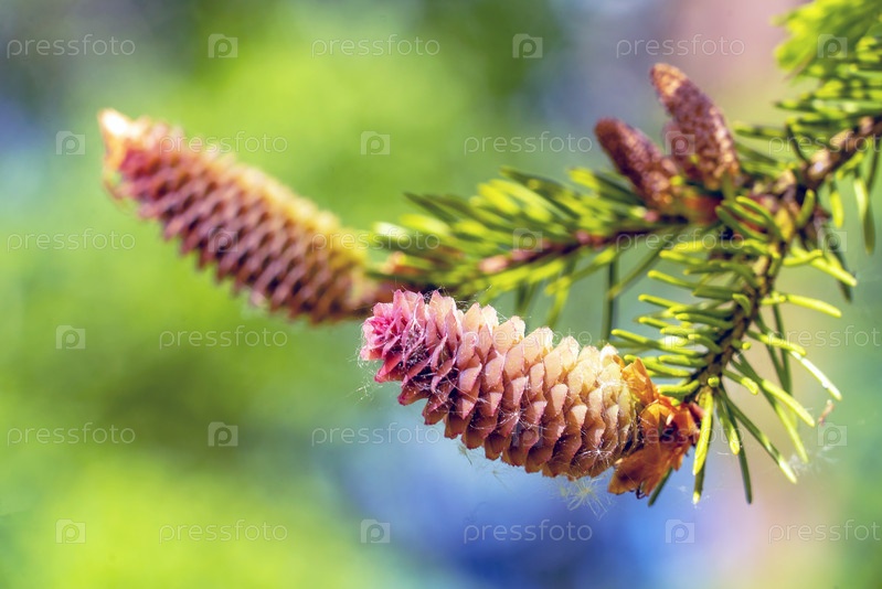 Еловые шишки растут рядом на ветке с иголками. Новые плоды хвойного дерева
