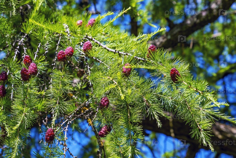 Молодые фиолетовые сочные шишки лиственницы на ветке