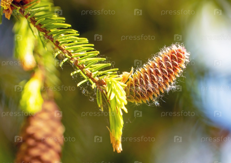 Еловые шишки растут рядом на ветке с иголками. Новые плоды хвойного дерева