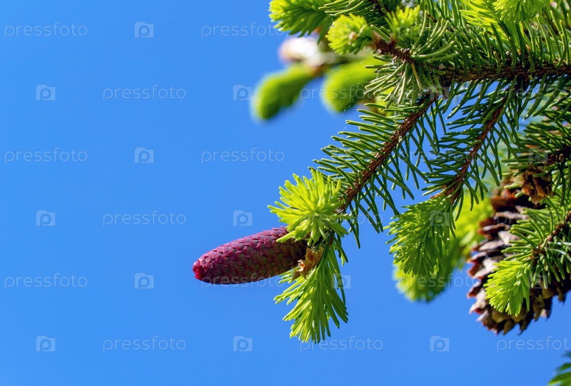 Еловые шишки растут рядом на ветке с иголками. Новые плоды хвойного дерева