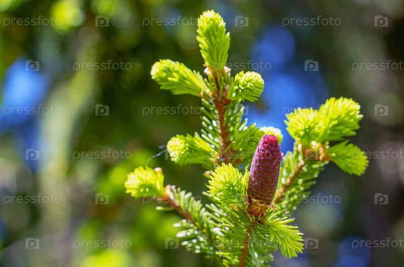 Еловые шишки растут рядом на ветке с иголками. Новые плоды хвойного дерева