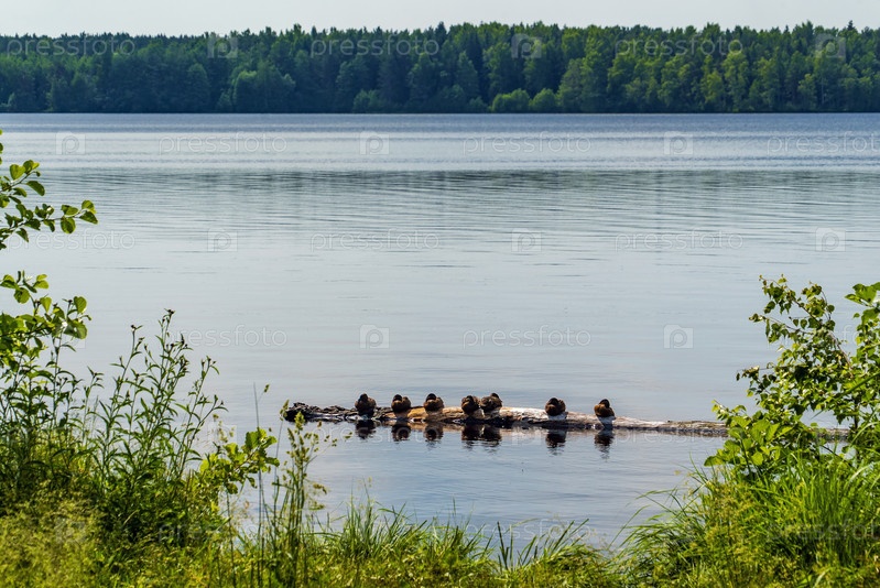 Дикие утки мирно сидят на бревне в озере. Всеволожск. Ленинградская область