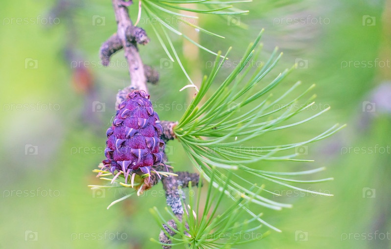 Еловые шишки растут рядом на ветке с иголками. Новые плоды хвойного дерева