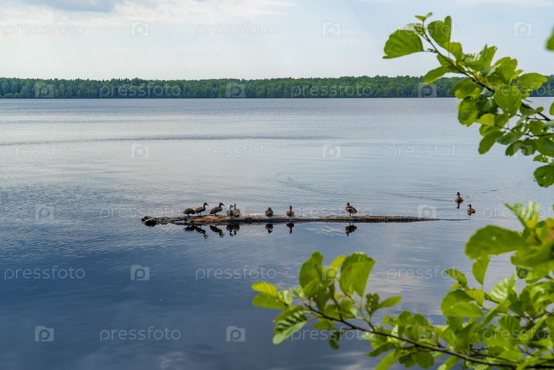 Дикие утки мирно сидят на бревне в озере. Всеволожск. Ленинградская область